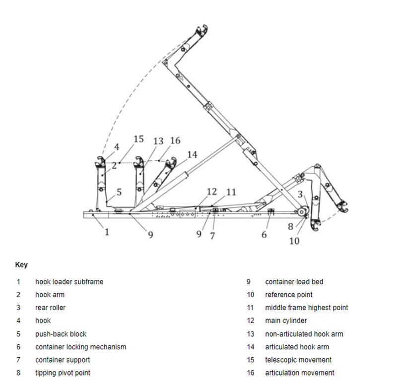 Chu trình hoạt động như sau: Trong quá trình tải, tay móc sẽ khớp với móc phía trước của thùng rác, và hệ thống thủy lực sẽ kéo thùng rác nhẹ nhàng vào khung và cố định thùng. Trong quá trình dỡ hàng, tay móc sẽ từ từ đẩy thùng rác ra khỏi khung, tách thùng rác ra khỏi khung gầm để dễ dàng tái chế.