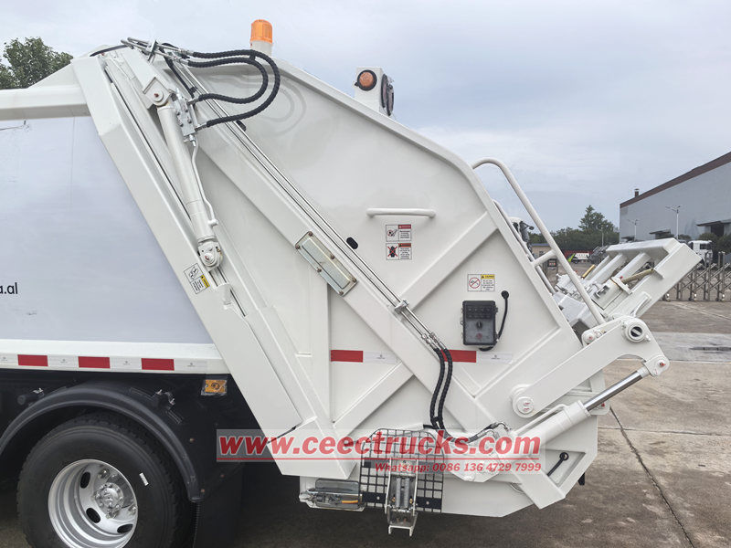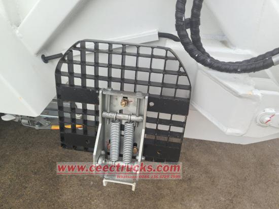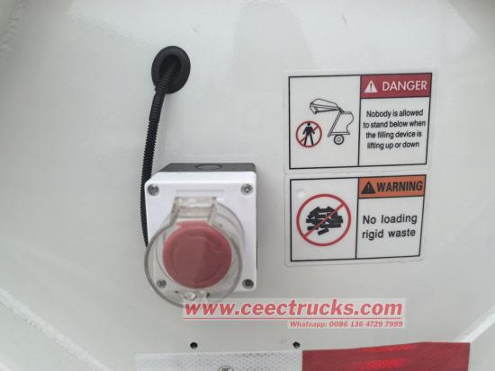 Để đảm bảo an toàn cho người vận hành và thiết bị, xe được thiết kế với nhiều cơ chế bảo vệ an toàn. Nút dừng khẩn cấp được trang bị để dừng ngay lập tức thiết bị nén rác ở bất kỳ trạng thái hoặc vị trí nào, nhằm ngăn ngừa tai nạn. Ngoài ra, xi lanh nâng được trang bị van chống nổ, có thể ngăn chặn máy nạp rác rơi xuống khi ống dẫn dầu đột ngột bị vỡ, tránh nguy hiểm.