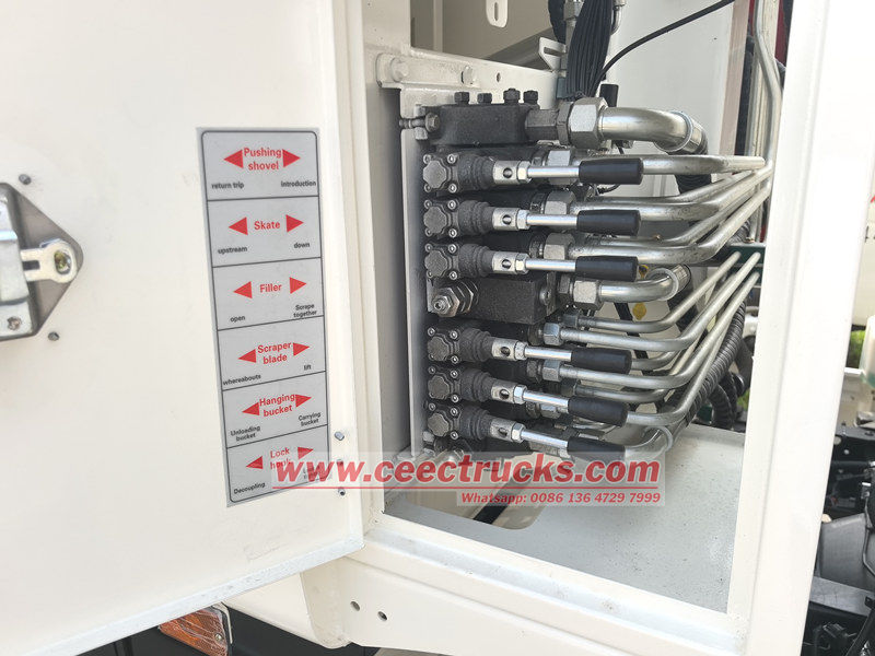 ● Khi dỡ rác, xi lanh nâng sẽ nâng cửa sau của máy nạp rác dọc theo lỗ dẫn hướng để mở khóa, và tấm đẩy di chuyển về phía sau để đẩy rác ra ngoài. Toàn bộ quá trình được vận hành bằng một nút bấm của hệ thống điều khiển điện tử, đảm bảo hiệu quả và an toàn.