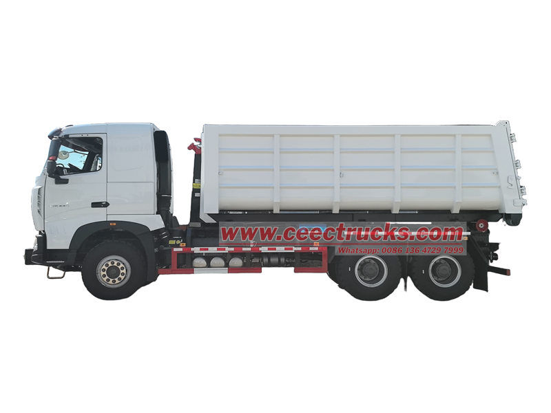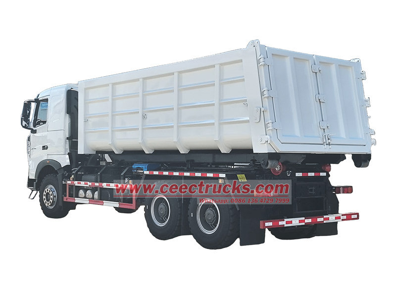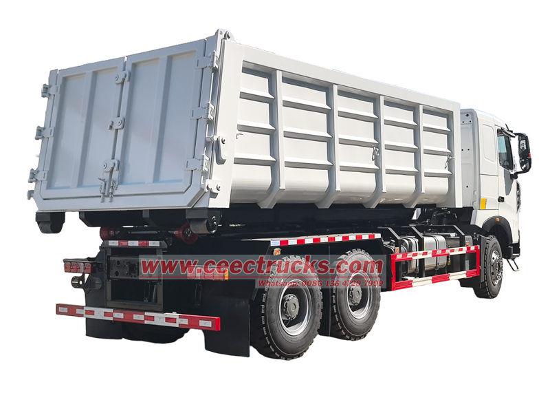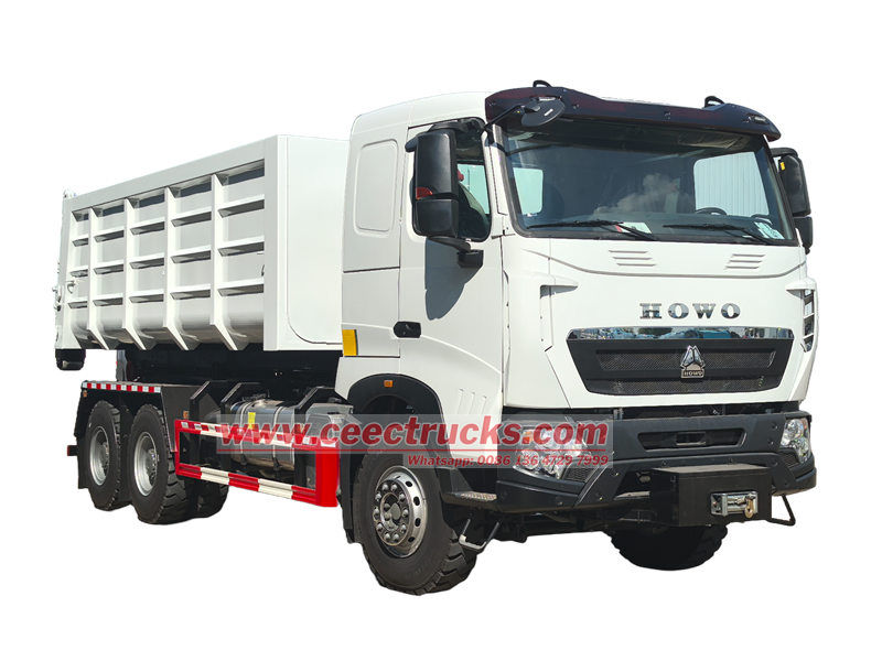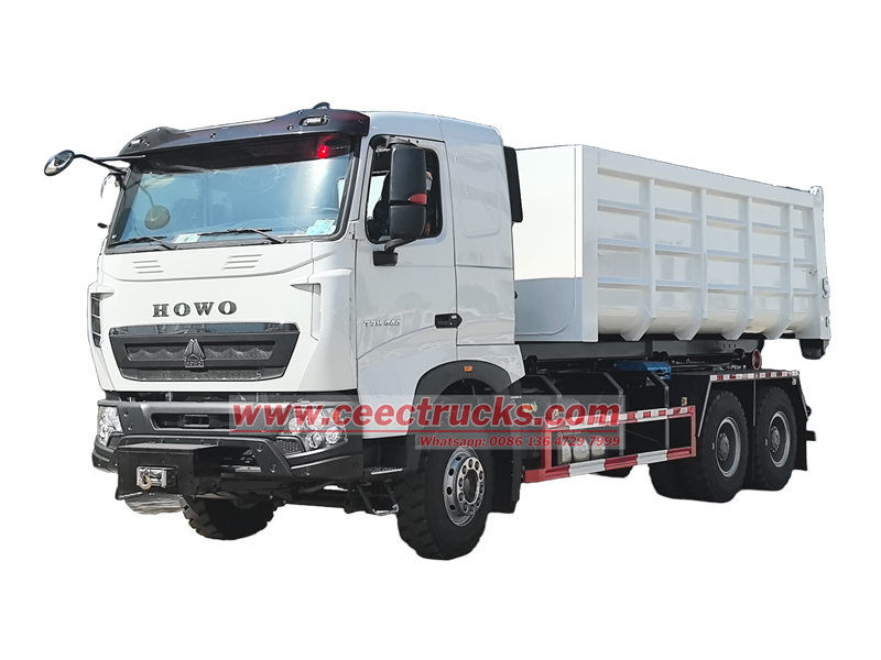 Xe tải móc cẩu Howo 20 tấn là một phương tiện vệ sinh hiệu quả cao. Điểm nổi bật của xe là khung gầm và giá đỡ có thể tháo rời, được trang bị hệ thống tay móc thủy lực cho phép nâng, xếp, dỡ và di chuyển thùng rác nhanh chóng, đảm bảo vận hành linh hoạt và thuận tiện.
