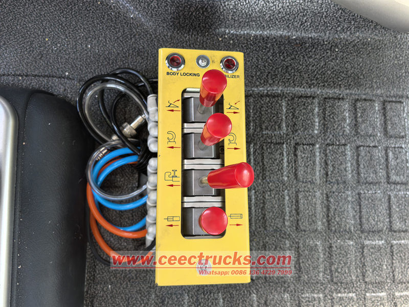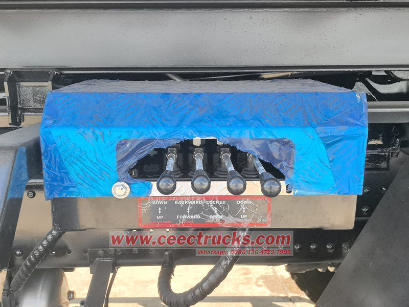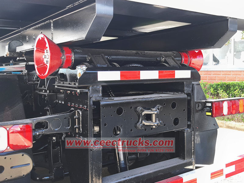 Xe tải được trang bị 11 lốp 12.00R20, tăng khả năng chịu tải và thích ứng với nhiều điều kiện đường xá khác nhau. Xe có thân và khung gầm riêng biệt, với tay móc thủy lực ở phía sau, cho phép bốc dỡ và di chuyển thùng rác nhanh chóng.