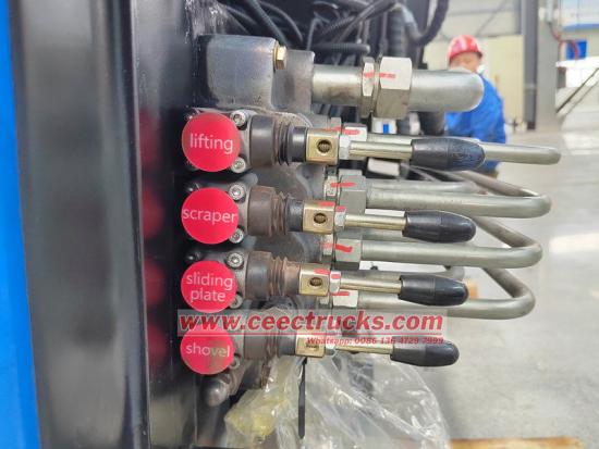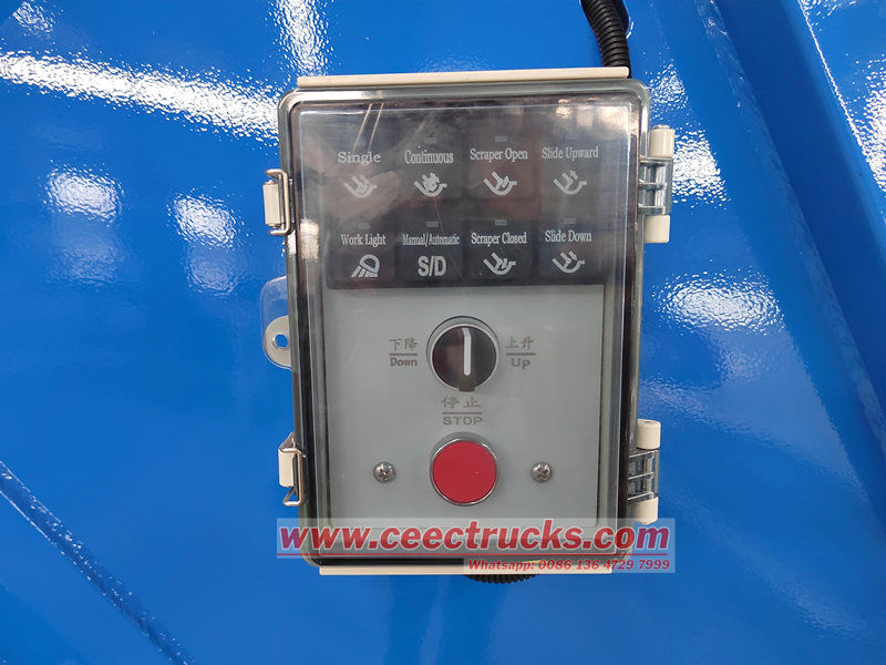 ♦ Kết cấu: Nằm ở phía sau của thùng chứa, nó bao gồm một dụng cụ cạo, một tấm trượt, các tấm bên và một xi lanh thủy lực, trông giống như một cái phễu.