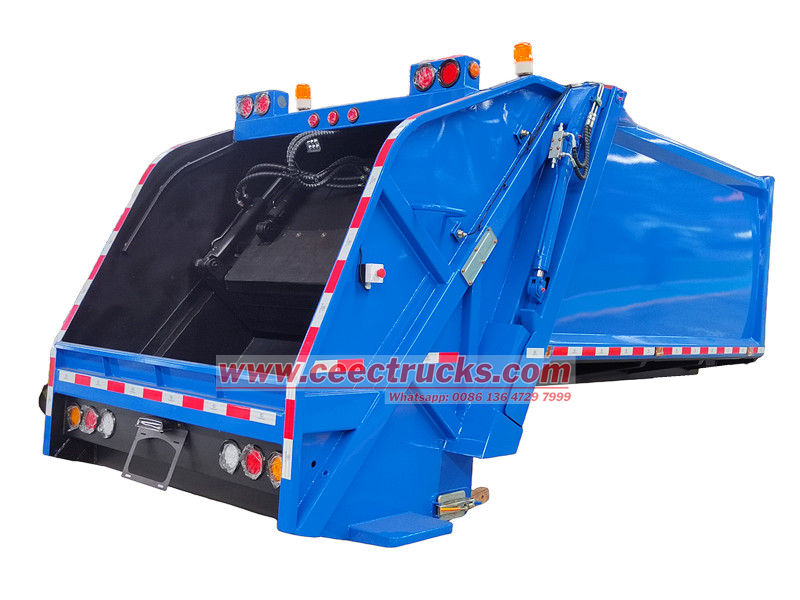 Volume optional 5-20cbmThùng chứa rác thải phía sau 10 CBM tùy chỉnh kết hợp khả năng thu gom hiệu quả, khả năng nén mạnh mẽ và vận chuyển kín. Được chế tạo từ thép chịu lực cao, chống mài mòn, khoang kín có cơ cấu đẩy và nạp liệu thủy lực để nghiền rác tự động và nén mật độ cao.