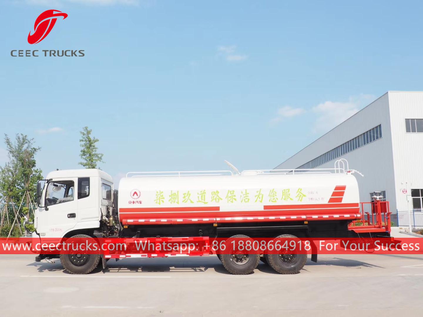 Xe tải nước DONGFENG 15.000L, khung gầm dẫn động tay trái DONGFENG 6x4, hộp số sàn 8 cấp, động cơ diesel CUMMINS 210HP, máy bơm nước thương hiệu nổi tiếng, có vòi phun trước, giữa và sau tùy chọn. Tất cả các bức tranh và logo đều phụ thuộc vào yêu cầu.