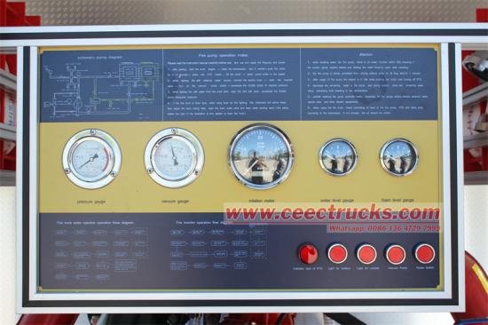 ●Bảng điều khiển:máy đo tốc độ tích hợp (theo dõi tốc độ động cơ), máy đo chân không (phát hiện chân không của bơm), máy đo áp suất (hiển thị áp suất nước theo thời gian thực), máy đo mức bọt (hiển thị lượng chất lỏng bọt còn lại), máy đo mực nước (hiển thị mực nước trong bình chứa nước).