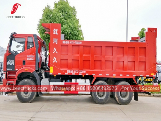 Tajikistan Xe ben 50T, khung gầm 6x4 dẫn động bên trái FAW, số tay 9 cấp hộp số, động cơ diesel FAW 340HP, thân xe ben bằng thép cường độ cao cho dự án khai thác mỏ, với HYVA hoặc máy nâng thủy lực trong nước tùy chọn. Tất cả bức tranh và logo phụ thuộc vào yêu cầu.
