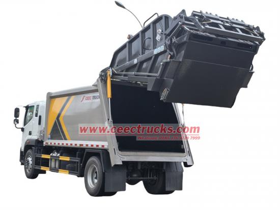 Rear tilting device for 360L and 1100L metal binsXe ép rác FOTON 16CBM là thiết bị quản lý chất thải được thiết kế siêu bền, dựa trên khung gầm xe tải 4x2 model 1086VLPHK-0FDA01. Xe tải xúc lật FOTON AUMAN được trang bị động cơ diesel ISDe270 30 model 270HP của thương hiệu CUMMINS, hệ thống truyền động được trang bị công nghệ tăng áp và làm mát trung gian, khí thải 6700cc, mạnh mẽ và bền bỉ hơn để leo núi. Kết hợp với hộp số sàn ZF 8 cấp, trục trước 4,2 tấn và trục sau 9 tấn, lắp lốp 295/80R22.5, đảm bảo khả năng chịu tải mạnh mẽ. Được lắp thân máy nén 16cbm, hình dạng cong dựa trên vật liệu T420, độ dày cho thành 4mm và sàn 5mm, được trang bị van cân bằng hai chiều và công tắc quang điện tử để đảm bảo an toàn, thiết bị nghiêng phía sau có thể được sử dụng để nạp thùng rác 360L và 1100L, thích hợp cho việc thu gom và vận chuyển rác thải địa phương trong cộng đồng và nhà máy. Hệ thống điều khiển điện CAN BUS và hệ thống điều khiển van thủy lực hoạt động cùng nhau để làm cho xe quản lý chất thải FOTON 16000L rất phổ biến và đáng tin cậy tại Thủ đô Santiago của Chile.