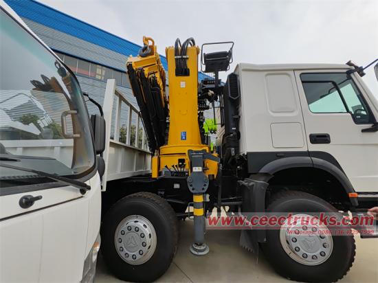 Xe cẩu tay gấp HOWO 28 tấn sử dụng khung gầm HOWO 8x4, cabin nửa mặt trước mới HW76, 2150+4575+1400mm, được trang bị động cơ WP10.380E22 Euro III 380HP, hộp số HW19710 10 cấp, lốp 12.00R20, kích thước hộp tải trên 9000 × 2400 × 800mm, mặt bên 6 đáy 8 độ dày, tải bằng cần trục tay gấp 6 đoạn XCMG GSQZ560.6, Mô men nâng tối đa 519kN.m, Sức nâng tối đa 28000kg, Chiều dài cần thủy lực tối đa 16,24m, cần trục quay toàn phần 360 độ, 4 chân chống thủy lực, Áp suất làm việc tối đa 32Mpa, trọng tải cần trục 6,9 tấn, có cần điều khiển trên không, cần điều khiển thủy lực thủ công ở cả hai bên cần trục và 3 vị trí vận hành khác.