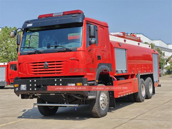 ThvàXe cứu hỏa Howo off-road sử dụng khung gầm hạng nặng Sinotruk với dạng truyền động 6x6. Được trang bị động cơ WD615.47 với công suất định mức 371 mã lực và hộp số sàn với 12 số tiến và 2 số lùi. Xe cứu hỏa Howo 6x6 có dung tích thùng chứa 8000L nước và 1500L bọt, được làm bằng vật liệu composite PP có đặc tính chống ăn mòn. Trên nóc xe lắp đặt màn hình báo cháy với lưu lượng 45L/giây và phạm vi hơn 55 mét.