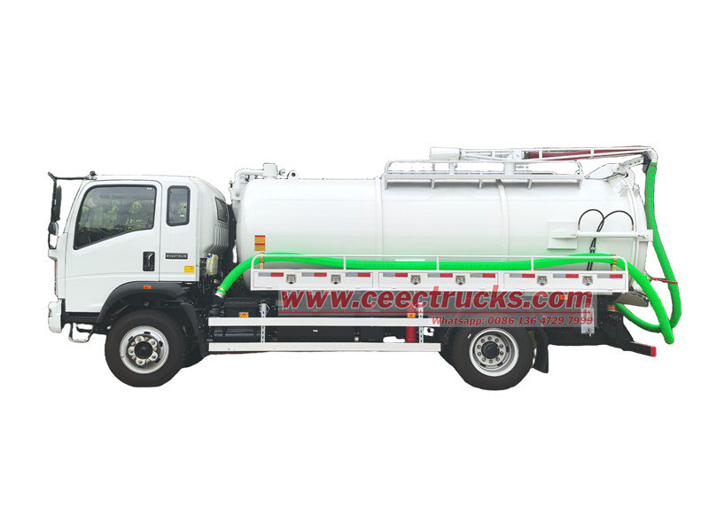Xe hút bể phốt trục đơn Howo 5.000 lít (còn gọi là xe bơm hút chân không Howo 5cbm, xe bồn hút chân không Howo 5.000 lít, xe bơm bể phốt Howo 4x2, xe bồn bơm hút bể phốt Howo 6 bánh, xe hút nước thải chân không Howo.) Được sử dụng để thu gom, vận chuyển và xả chất lỏng như nước bẩn, bùn, nước thải sinh hoạt. Thân bồn được xử lý chống ăn mòn, chống gỉ sét, có độ bền cực cao. Kết hợp với bơm chân không công suất lớn, bồn có lực hút mạnh, là thiết bị chuyên nghiệp không thể thiếu trong quản lý môi trường đô thị và nông thôn.