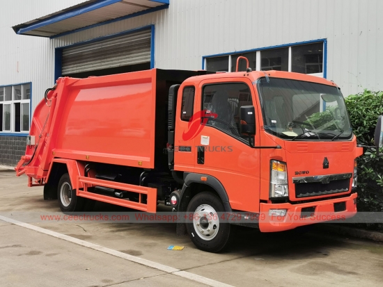 Xe tải đầm rác HOWO RHD 8cbm, khung gầm xe tải sử dụng động cơ diesel YUCHAI 160HP, hộp số sàn 6 cấp. Hộp điều khiển CAN-BUS để vận hành dễ dàng. Tất cả các bức tranh và logo dựa trên yêu cầu của khách hàng.