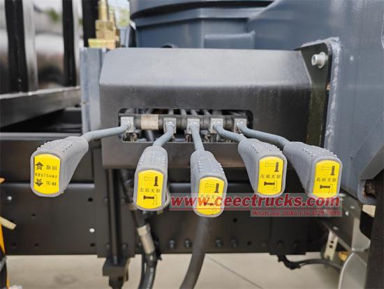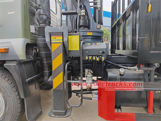 ● Bố trí cần cẩu: Cần trục tay thẳng XCMG KSQS200-4 được lắp đặt ở phía trước thùng hàng, bàn xoay được kết nối cứng với khung gầm bằng bu lông và vị trí lắp đặt đối trọng được dành riêng để tăng cường độ ổn định. Bố trí thùng hàng và cần trục đã được tính toán theo trọng tâm để đảm bảo phân phối tải trọng trục hợp lý trong quá trình lái xe.