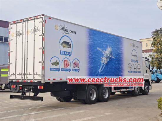 Xe tải lạnh Isuzu Giga 8x4 được sửa đổi trên cơ sở khung gầm xe taxi Isuzu Giga VC66, được trang bị 1850+4575+1370mm chiều dài cơ sở FRP + PU Bọt + vật liệu FRP 105mm, cửa sau mở đôi kích thước đầy đủ Chiếc xe tải lạnh này chủ yếu được sử dụng để vận chuyển hải sản và là một lựa chọn lý tưởng trong lĩnh vực hậu cần chuỗi lạnh như hải sản.