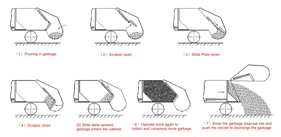 Năng lượng do động cơ xe tạo ra được truyền đến bơm dầu thông qua bộ ngắt điện và trục truyền động, bơm dầu quay để tạo ra dầu áp suất cao. Bằng cách vận hành công tắc điều khiển trên van đảo chiều đa chiều, dầu thủy lực sẽ điều khiển các xi lanh liên quan hoạt động. Những xi lanh này dẫn động xẻng đẩy, máy cạp, ván trượt và các cơ cấu khác để hoàn thành nhiệm vụ bốc và nén rác. Trong quá trình tải, rác được đổ vào thùng rác, sau đó rác dần dần được nén đến trạng thái mật độ cao thông qua lực đẩy của xẻng đẩy và sự phối hợp của máy cạo và ván trượt. Khi thùng rác đầy, xe sẽ vận chuyển rác đến địa điểm quy định để dỡ xuống.