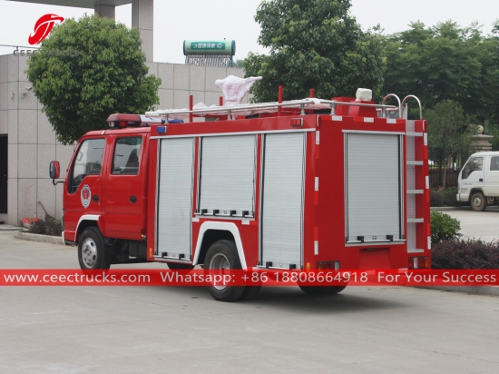 Xe cứu hỏa chở nước ISUZU 3CBM, sử dụng xe tay lái bên trái ISUZU 600P khung gầm 4x2, số sàn 5 cấp hộp số, động cơ diesel ISUZU 120HP, bồn chứa nước dung tích 3000 Lít, bức tranh và logo phụ thuộc vào yêu cầu.