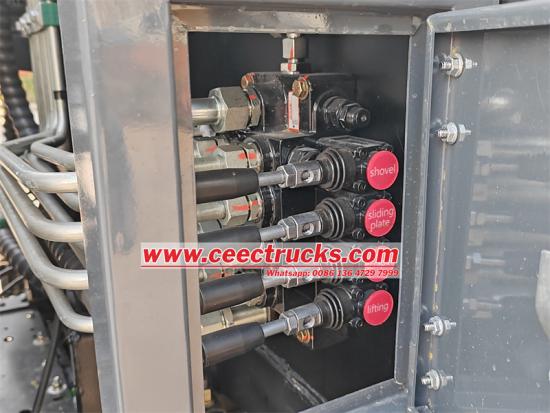 Điều khiển điện trong cabin:Người lái xe có thể trực tiếp điều khiển chế độ nâng, xếp dỡ cửa sau, làm sạch cửa sau cũng như đẩy và kéo xẻng đẩy thông qua bảng điều khiển điện trong cabin thoải mái, giúp cải thiện sự thuận tiện và an toàn khi vận hành.
