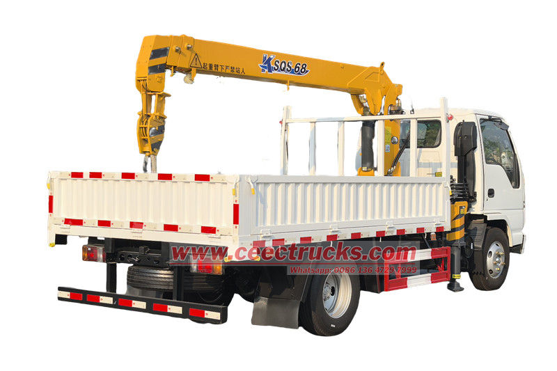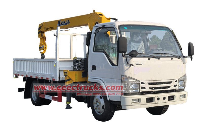 Xe tải cẩu Isuzu ELF 3.2 tấn còn được gọi là xe tải Isuzu ELF có cần cẩu nâng 3.2 tấn, xe cẩu ống lồng, xe cần cẩu dịch vụ, xe cẩu gắn trên xe cẩu ống lồng, v.v. Xe được cải tiến trên khung gầm Isuzu 100P, trang bị động cơ Isuzu 4KH1CN6LB 120HP, mạnh mẽ, kết hợp với hộp số MSB 5 cấp, sang số êm ái, phía sau thân xe có cần cẩu SQS-68, sức nâng và tầm với lớn, bên dưới có thùng hàng kích thước 3000x2100x450mm, có thể dễ dàng chở các vật nặng được móc cẩu nâng lên.