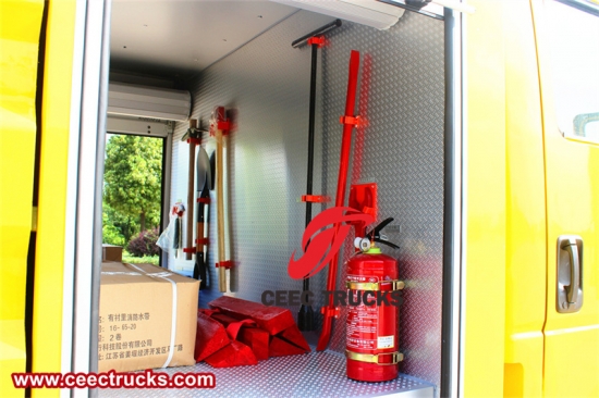 Có đèn xoay báo động và được gắn trên nóc cabin, có thiết bị chữa cháy và dụng cụ trên xe. |