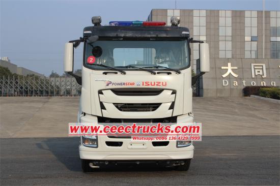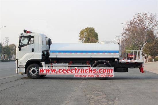 Xe tải bể chứa nước ISUZU FTR 10000 lít được sửa đổi từ khung xe cơ sở Isuzu Ftr Giga 4X CAB 4500mm, với động cơ diesel ISUZU 4HK1-TCG60 và hộp số 6 cấp MLD Cơ thể trên xe là bình nước thép carbon hình elip 10cbm, được trang bị máy bơm Weilong 80QZF-60/90S Có các hộp lưu trữ đường ống ở cả hai bên của bể, xe tăng là một nền tảng làm việc, với một khẩu súng phun nước áp suất cao và một JBQ5 5/9 0 Bộ máy bơm lửa di động Chiếc xe có 3 phương pháp phun: vòi phun nước phía trước, vòi phun nước phía sau và màn hình phun nước.