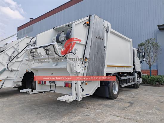 Cốt lõi của xe tải rác phía sau là cơ cấu nén (như lưỡi gạt và tấm trượt) để nén chặt rác rời. Xe tải ép rác Isuzu GIGA F-serious 16 khối (16 lít) thường di chuyển qua lại từ phía sau ra phía trước thùng.