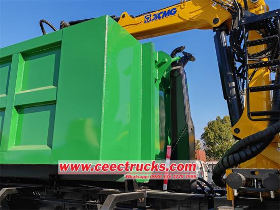 Tail-End Steel Scrap Grab: Một tính năng chuyên dụng của cần cẩu này là lấy phế liệu bằng thép được gắn ở đầu đuôi của nó Việc lấy này được thiết kế để giữ an toàn và điều khiển phế liệu thép, làm cho xe tải hiệu quả cao trong việc tái chế và hoạt động quản lý chất thải