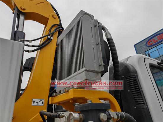 Nổi bật nhất là cần cẩu gầu ngoạm XCMG LQS78A được lắp đặt trên xe. Loại cần cẩu này tích hợp công nghệ thủy lực tiên tiến và cấu trúc cơ khí chính xác, với mô-men xoắn nâng tối đa 6.8TM, tải trọng nâng tối đa 700kg, chiều cao nâng tối đa 9.8m, chiều dài cần cẩu 7.8m và góc quay đáng kinh ngạc 380°. ° , có thể vận hành gần như toàn diện mà không gặp trở ngại. Đầu cần cẩu được trang bị kẹp hai càng chuyên dụng để gắp gỗ. Kích thước kẹp tối đa khi mở ra là 1220mm. Nó có thể gắp gỗ nặng tới 1 tấn mỗi lần, cải thiện đáng kể hiệu quả quản lý tài nguyên lâm nghiệp.