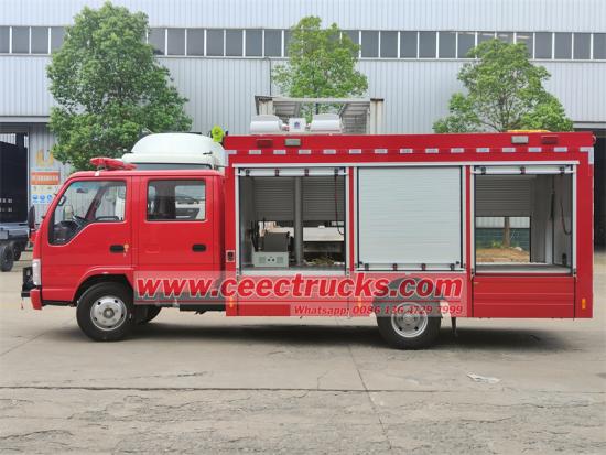 Xe cứu hỏa cứu hộ đa chức năng loại mini ISUZU, khoang lái hai hàng ghế với 2+4 chỗ ngồi, bao gồm 4 ghế SCBA, được trang bị động cơ diesel 4KH1CN6LB công suất 88KW và 120HP, hộp số sàn MSB 5 cấp với 5 số tiến và 1 số lùi. Phía sau khoang lái được cải tạo để chữa cháy, nhiều thành viên phi hành đoàn hơn, công suất mạnh, hiệu suất cơ học tốt, cấu trúc và bố trí hợp lý, cũng được lắp đặt thiết bị chiếu sáng nâng hạ dạng ống lồng, vận hành và bảo dưỡng thuận tiện, phù hợp với yêu cầu của hỏa hoạn trong chiến đấu thực tế.