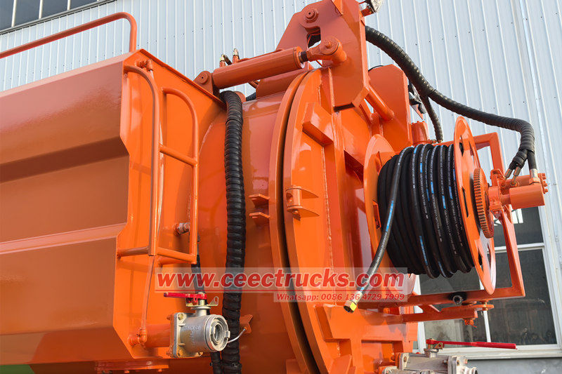 Xe được trang bị bơm nước áp suất cao để tạo áp suất nước sạch lên đến 16-240 MPa, đồng thời cắt và xả các vật cản cứng đầu như trầm tích, rễ cây, khối bê tông trên thành trong của đường ống thông qua vòi phun quay. Đồng thời, sử dụng bơm chân không để tạo áp suất âm trong thân bể để hút bùn nghiền và nước thải vào thân bể thông qua ống hút nước thải. Tời thủy lực được sử dụng để điều khiển độ giãn nở và co lại của đường ống áp suất cao trong suốt quá trình vận hành để đảm bảo rằng người vận hành có thể hoàn thành việc nạo vét đường ống sâu mà không cần xuống giếng.