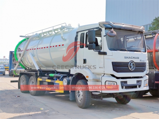 Xe tải nước thải chân không Shacman H3000 6Ã4 20000L xuất khẩu sang Châu Phi, động cơ diesel WEICHAI 340HP,Faust Hộp số tay 12 cấp, thùng chở vật liệu thép cacbon cường độ cao, dung tích có thể từ 16000 đến 25000 lít. Tùy chọn máy bơm chân không WEILONG nổi tiếng của Trung Quốc và máy bơm chân không JUROP / BP / MORO nhập khẩu, thiết bị nâng thủy lực để xả chất thải, sơn và logo tùy theo yêu cầu.