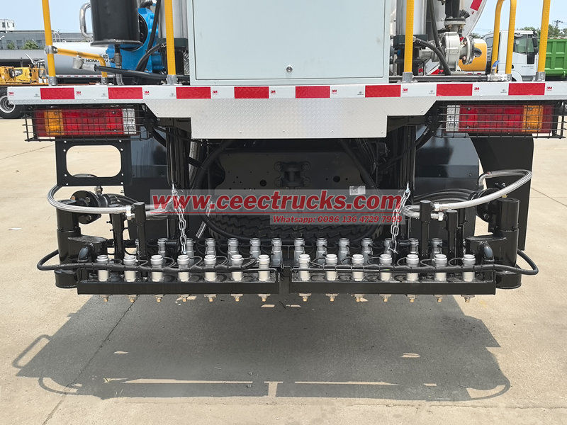 Phía sau xe bồn phân phối bitum Shacman X3000 được trang bị cần phun có thể thu vào với chiều rộng có thể điều chỉnh, được trang bị nhiều bộ vòi phun điều khiển lưu lượng có độ chính xác cao. Máy có thể điều chỉnh chính xác lượng phun và phạm vi bao phủ theo yêu cầu thi công (như lớp thấm, lớp kết dính và lớp bịt kín), đạt được phạm vi phun biến thiên rộng từ 0,2-3L/m².