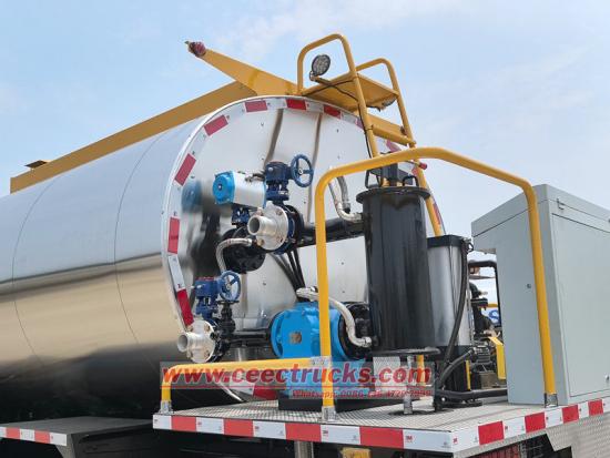Bồn chứa của xe tải rải nhựa đường Shacman là một trong những bộ phận cốt lõi. Bồn chứa chủ yếu được làm bằng thép cacbon cường độ cao hoặc thép không gỉ chất lượng cao. Bồn chứa có khả năng chịu áp lực và va đập tuyệt vời, thích ứng với điều kiện vận chuyển và vận hành phức tạp trên đường. Bồn chứa có cấu trúc hai lớp với vật liệu cách nhiệt hiệu suất cao ở giữa. Với hệ thống gia nhiệt điện tiên tiến, bồn chứa có thể duy trì chính xác nhiệt độ nhựa đường ở mức 180-220℃, với biên độ dao động nhiệt độ rất nhỏ, ngăn ngừa hiệu quả sự phân tầng và đông đặc của nhựa đường, đảm bảo tính lưu động và chất lượng thi công.
