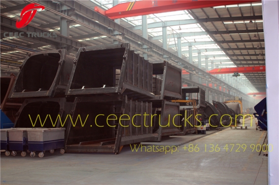 Nhà sản xuất xe tải nén rác 12CBM chất lượng HÀNG ĐẦU CEEC TRUCKS đã cung cấp cụm tấm bên thân máy đầm, vật liệu thép cường độ cao được cung cấp đặc biệt, độ dày mặt và đáy trên 5mm, sơn chống gỉ theo tiêu chuẩn, logo theo yêu cầu