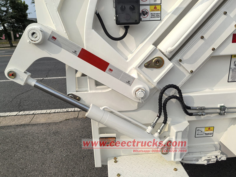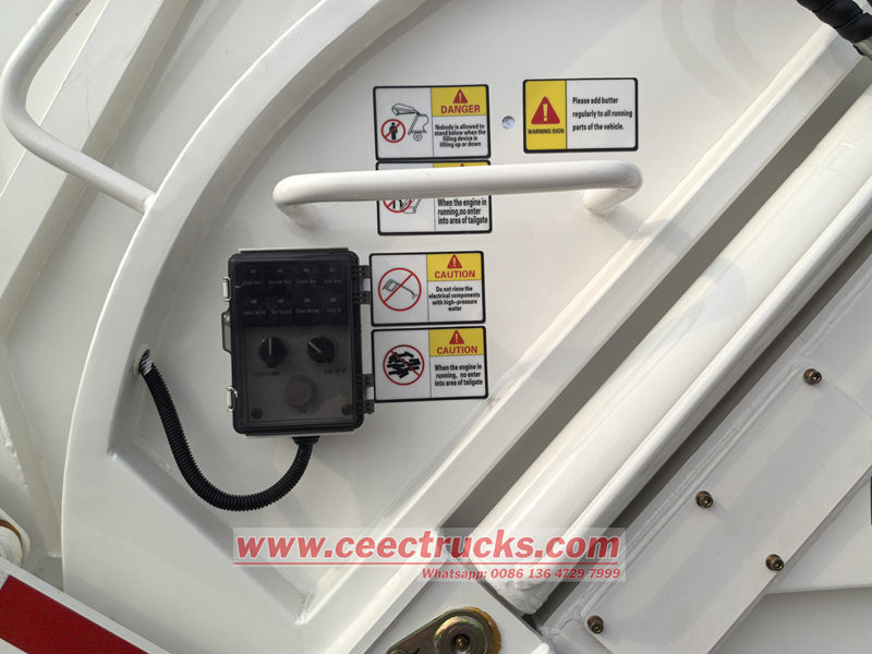Hộp điều khiển vận hành được lắp đặt trong cabin và phía sau xe. Hộp điều khiển vận hành trong cabin có thể điều khiển việc đẩy và dỡ hàng, đồng thời lựa chọn chế độ vận hành (tự động hoặc thủ công), và hộp điều khiển vận hành phía sau xe điều khiển hoạt động của cơ cấu ép và nạp liệu cũng như cơ cấu xoay thùng. Sử dụng và vận hành rất thuận tiện. Đặc biệt tại các bãi chôn lấp, người vận hành có thể hoàn thành việc dỡ hàng và xả nước thải mà không cần xuống xe. Thiết bị điều khiển từ xa có dây có thể được lắp đặt theo yêu cầu của người dùng.