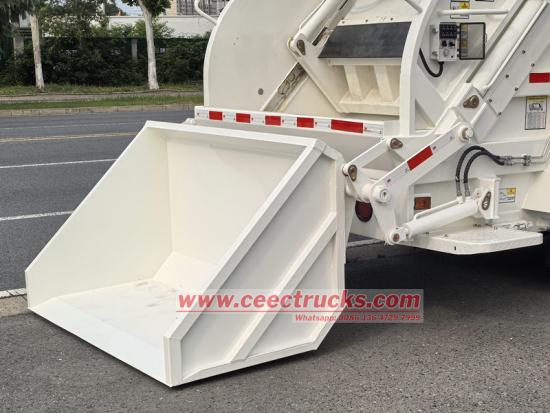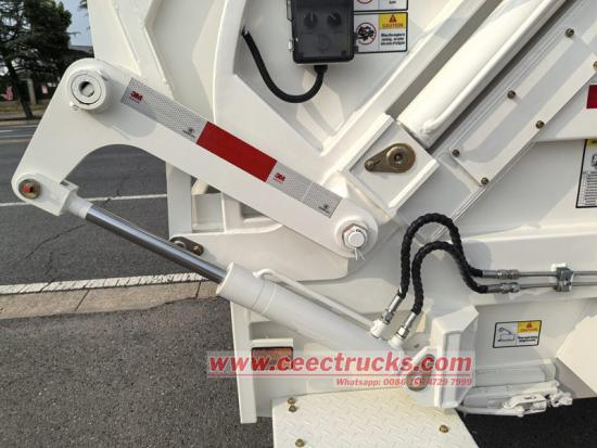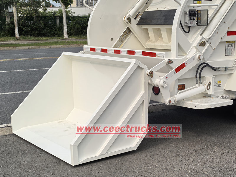 ● Máy nạp rác có một tấm trượt và một bộ phận gạt rác, được dẫn động bởi một xi lanh tấm trượt và một xi lanh gạt rác. Tấm trượt di chuyển trong các rãnh trượt ở cả hai bên máy nạp rác, và bộ phận gạt rác di chuyển quanh bản lề tấm trượt. Một xi lanh nâng và một cơ cấu khóa được lắp đặt giữa thùng rác và máy nạp rác. Xi lanh nâng điều khiển máy nạp rác nâng lên và hạ xuống, và cơ cấu khóa giữ máy nạp rác trên thùng rác.